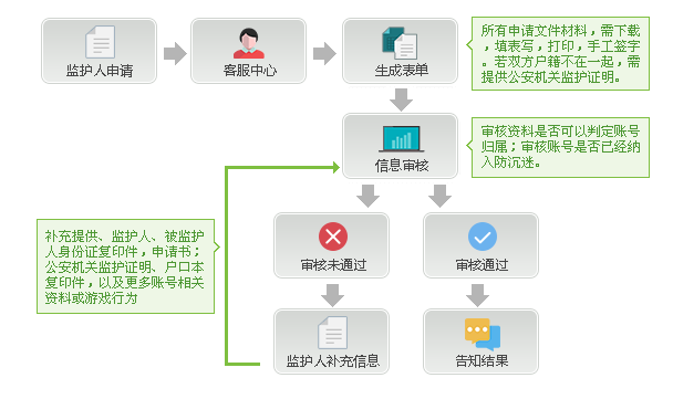 家长监护系统充分考虑家长的实际需求,当家长发现自己的孩子玩游戏过于沉迷的时候,由家长提供合法的监护人资质证明、游戏名称帐号、以及家长对于限制强度的愿望等信息,可对处于孩子游戏沉迷状态的帐号采取几种限制措施,解决未成年人沉迷网游的不良现象,如限制孩子每天玩游戏的时间区间和长度,也可以限制只有周末才可以游戏,或者完全禁止。